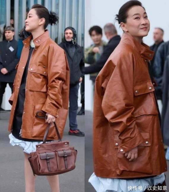 橙褐色宽松皮衣搭配黑色丝绸短裙,脚踩细带黑色高跟凉鞋,整体造型散发着复古摩登的气息,既大胆又富有艺术感。